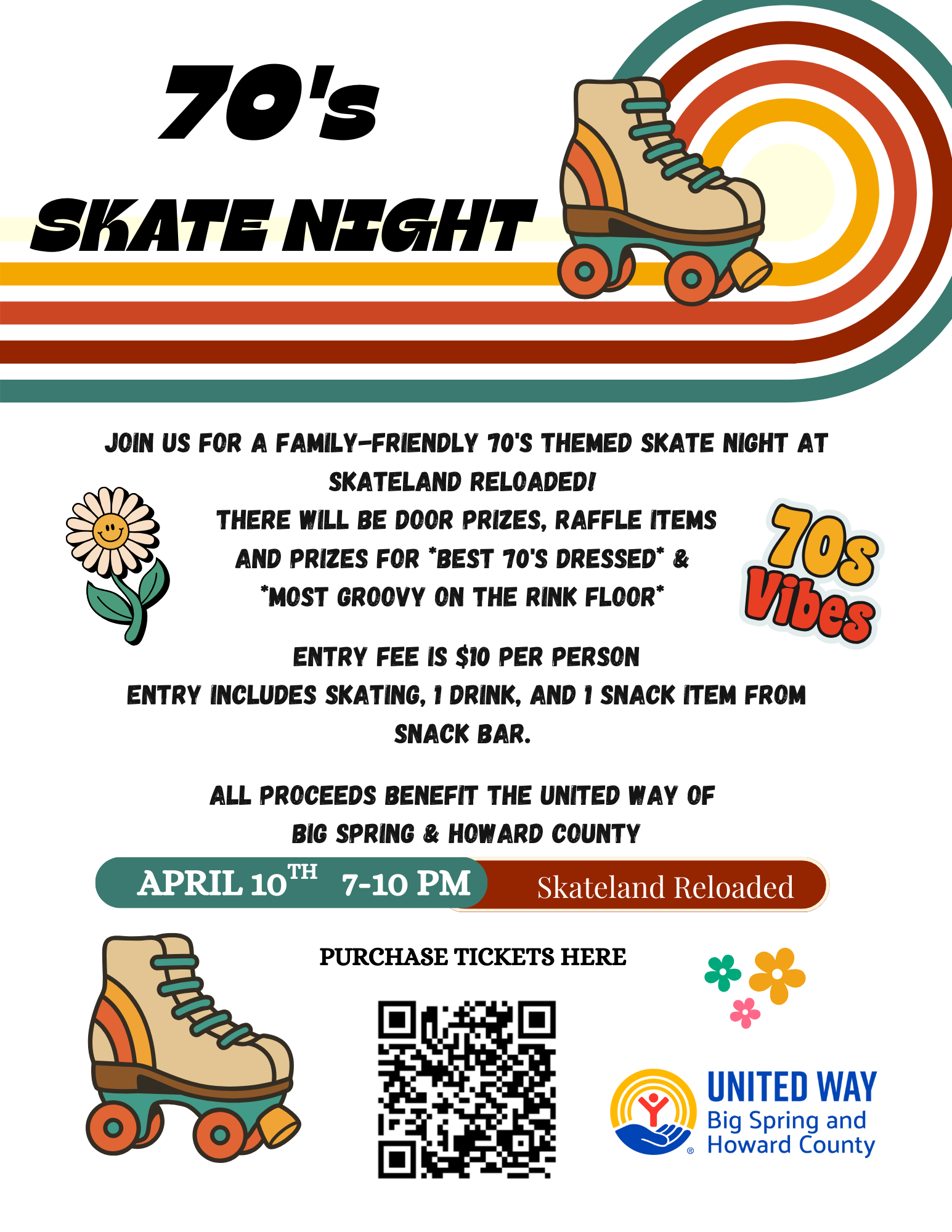 🤩 United Way Of Big Spring & Howard County is rolling into Spring with style! So, get ready to boogie on the skating rink floor while supporting a great cause! Join us for a Family Friendly night of 70's themed ROLLER SKATING at Skateland Reloaded in Big Spring! It's an event like no other, and we want you to be there! Bring your parents, bring your kids, bring your neighbors!